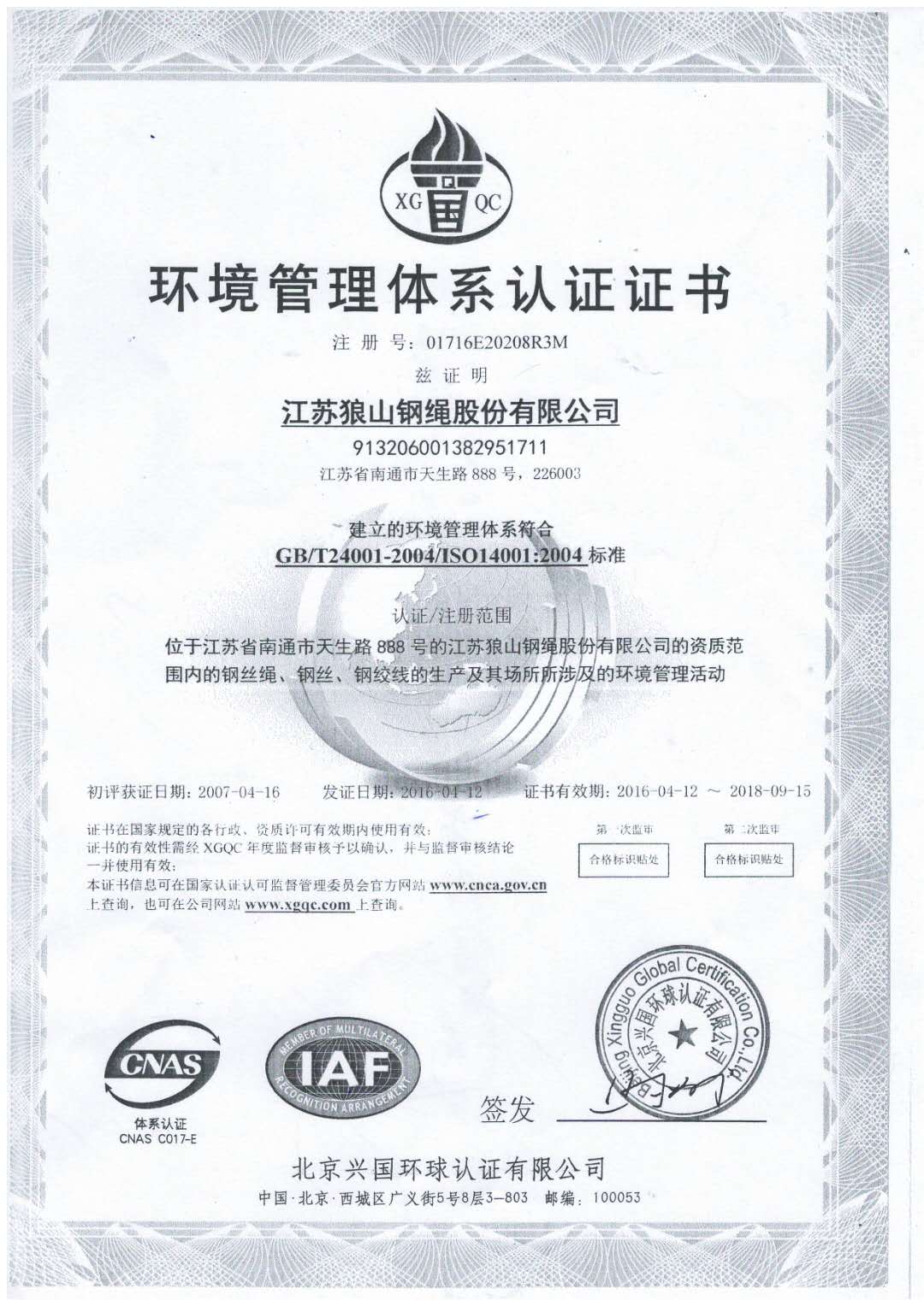 環(huán)境管理體系認(rèn)證證書